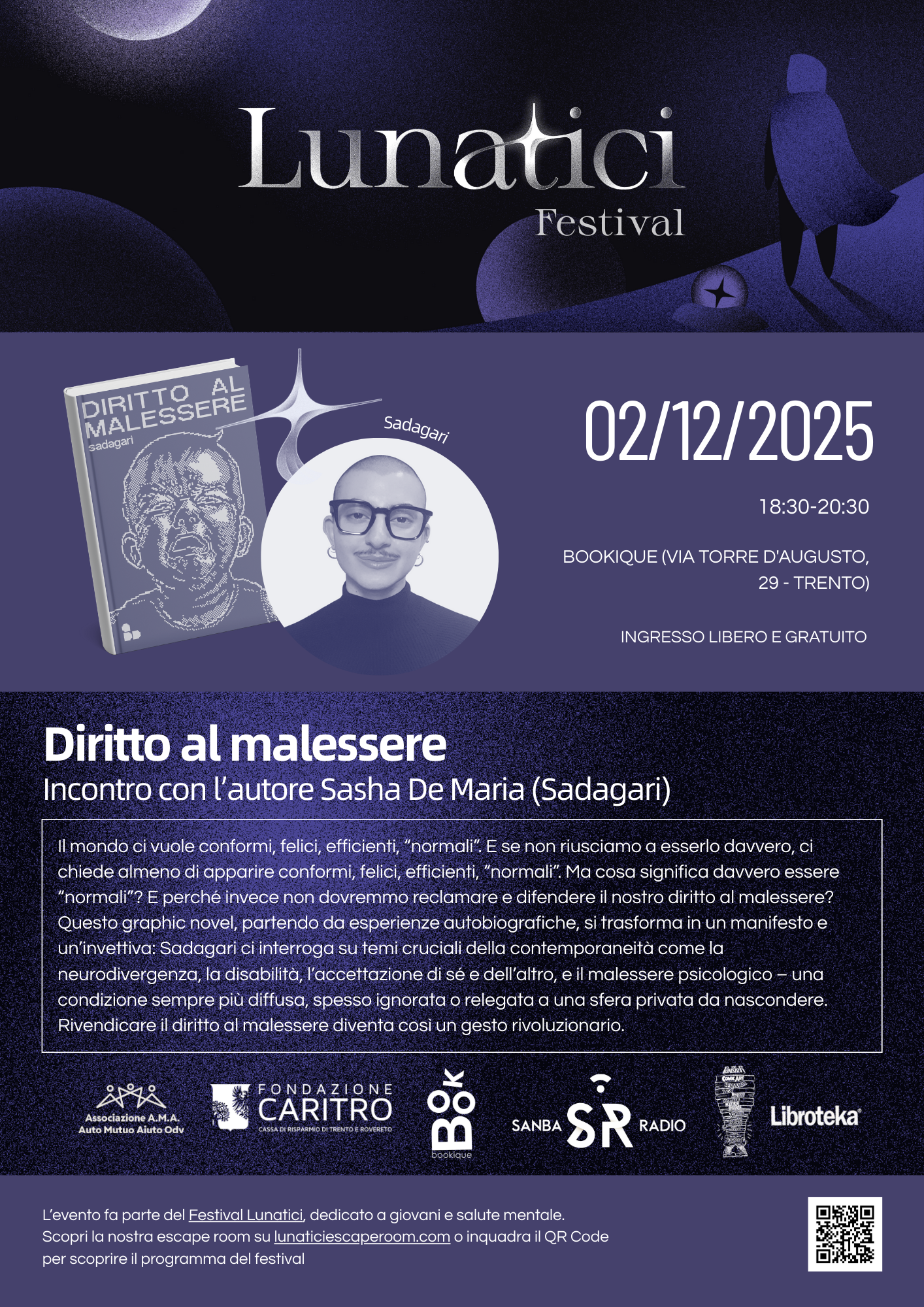 L’evento fa parte del Festival Lunatici, dedicato a giovani e salute mentale. Scopri la nostra escape room e il programma del festival su lunaticiescaperoom.com