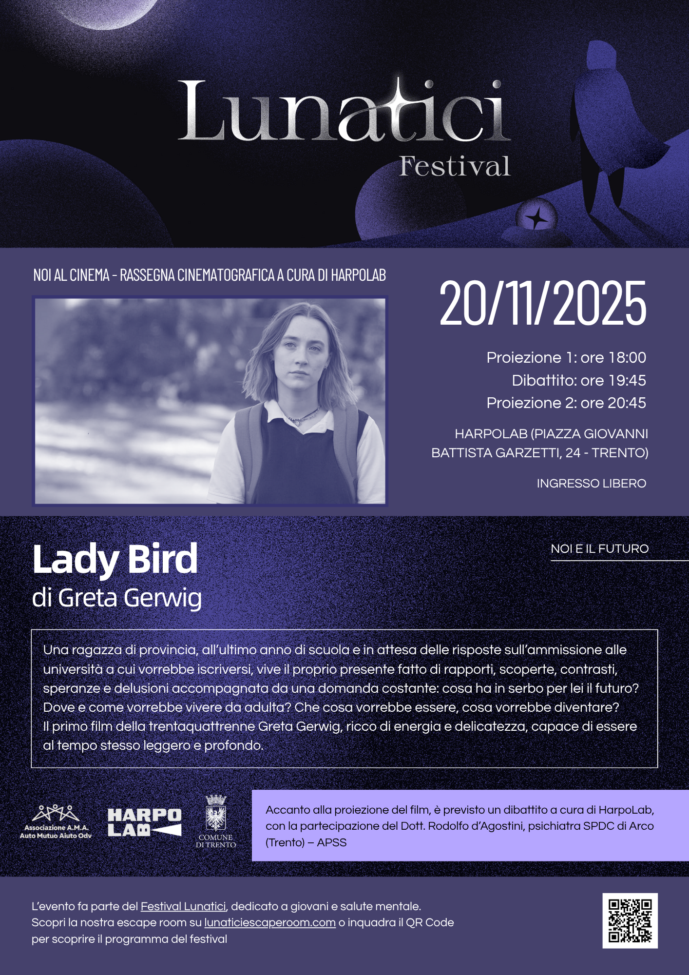 A seguire, confronto con il Dott. Rodolfo d’Agostini, psichiatra presso l’SPDC di Arco (APSS), per approfondire i temi del film e aprire uno spazio di riflessione su crescita, scelte e futuro.