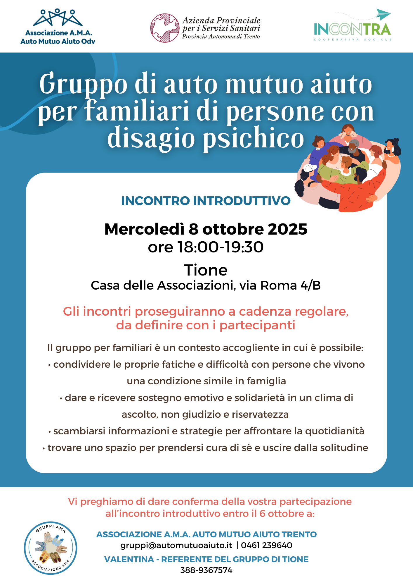Durante l’incontro sarà presentato il funzionamento del gruppo di auto mutuo aiuto per familiari di persone con disagio psichico. Gli appuntamenti successivi verranno definiti insieme ai partecipanti, con una cadenza regolare.
