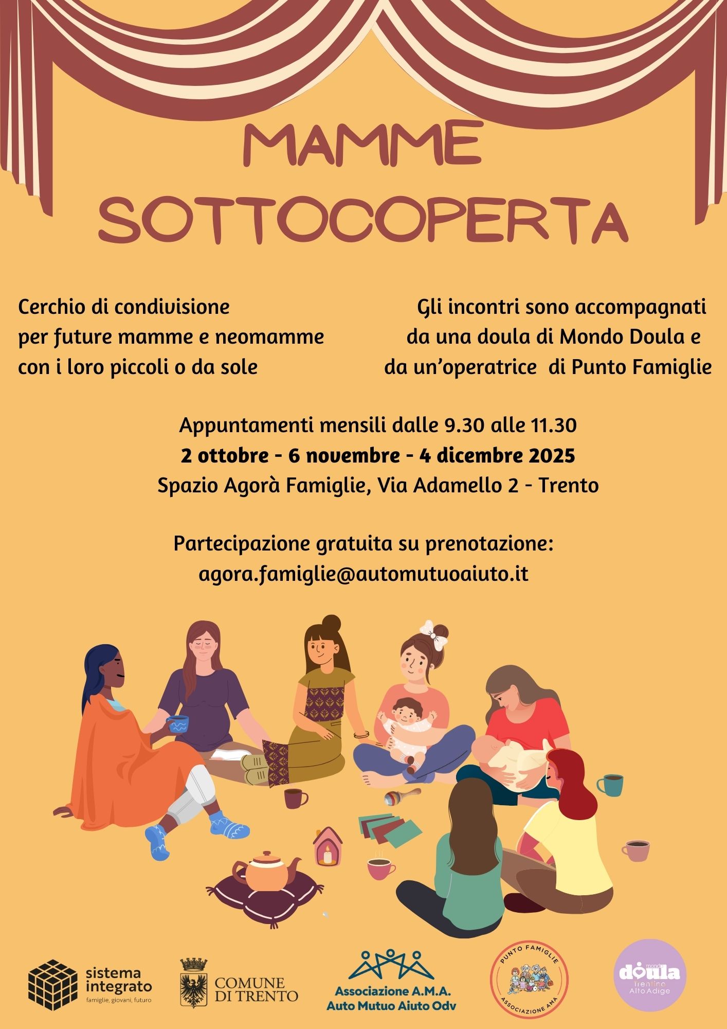 Un cerchio di condivisione dedicato alle future mamme e alle neo mamme, uno spazio dove fermarsi un momento, ritrovarsi e sentirsi accolte. Un’occasione per raccontarsi, ascoltare e intrecciare esperienze, con la possibilità di partecipare anche insieme ai propri piccoli. Un tempo per sé, da vivere in compagnia di chi sta attraversando lo stesso viaggio.
