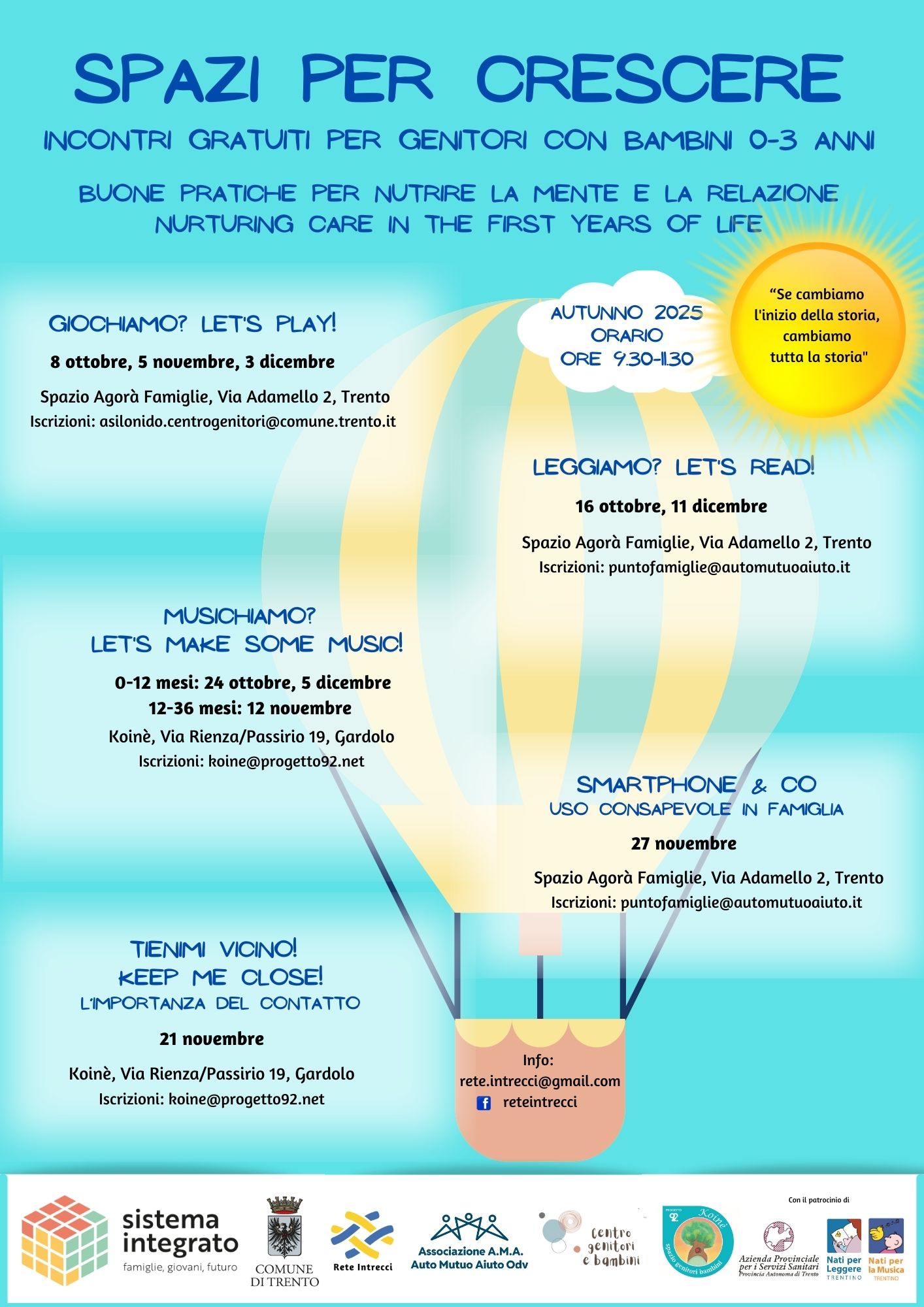 Gli incontri sono a cura di: Punto Famiglie – Associazione A.M.A.; Koinè – Progetto 92; Centro genitori e bambini – Servizio Infanzia del Comune di Trento.
