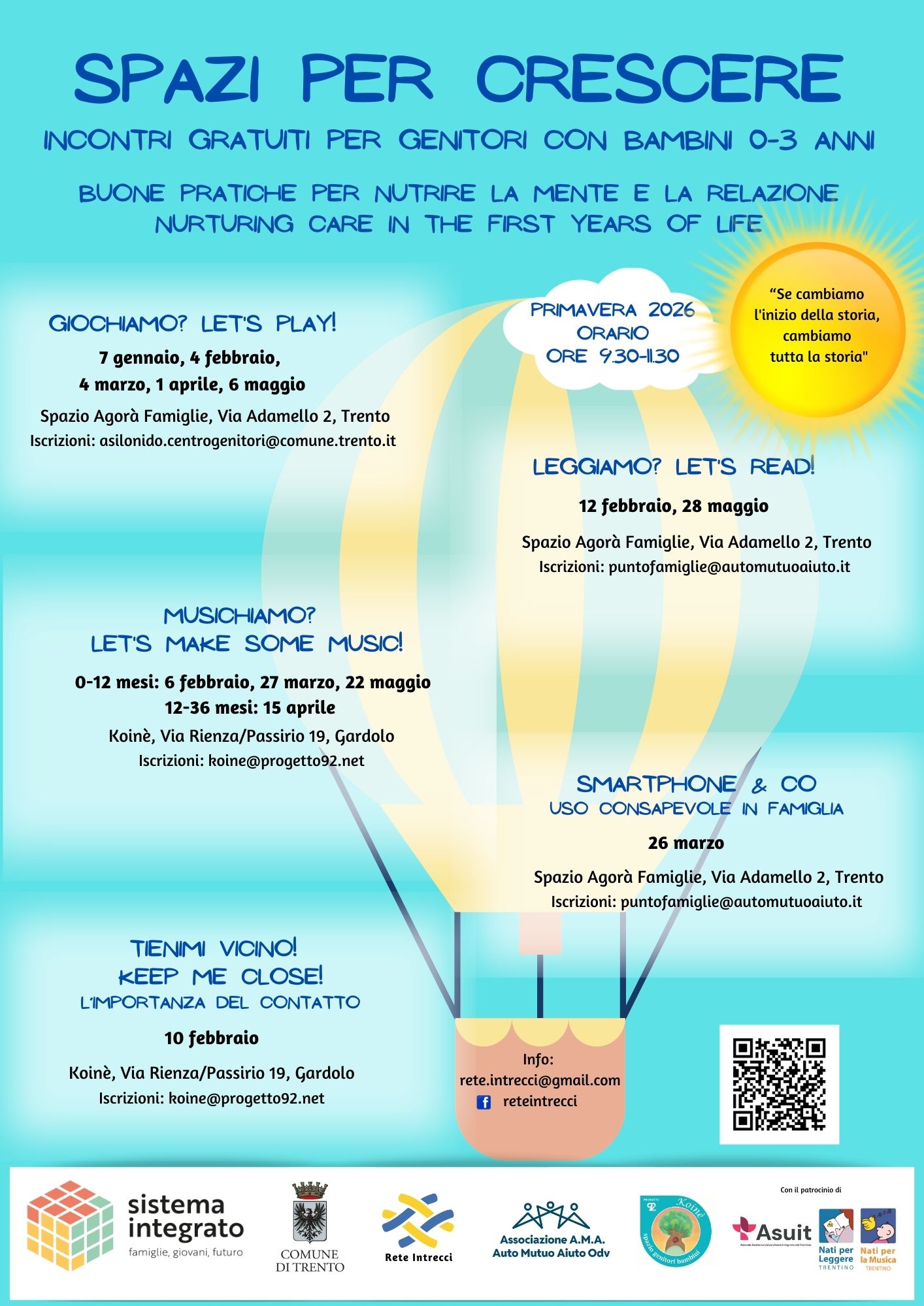 Gli incontri sono a cura di: Punto Famiglie – Associazione A.M.A.; Koinè – Progetto 92; Centro genitori e bambini – Servizio Infanzia del Comune di Trento.