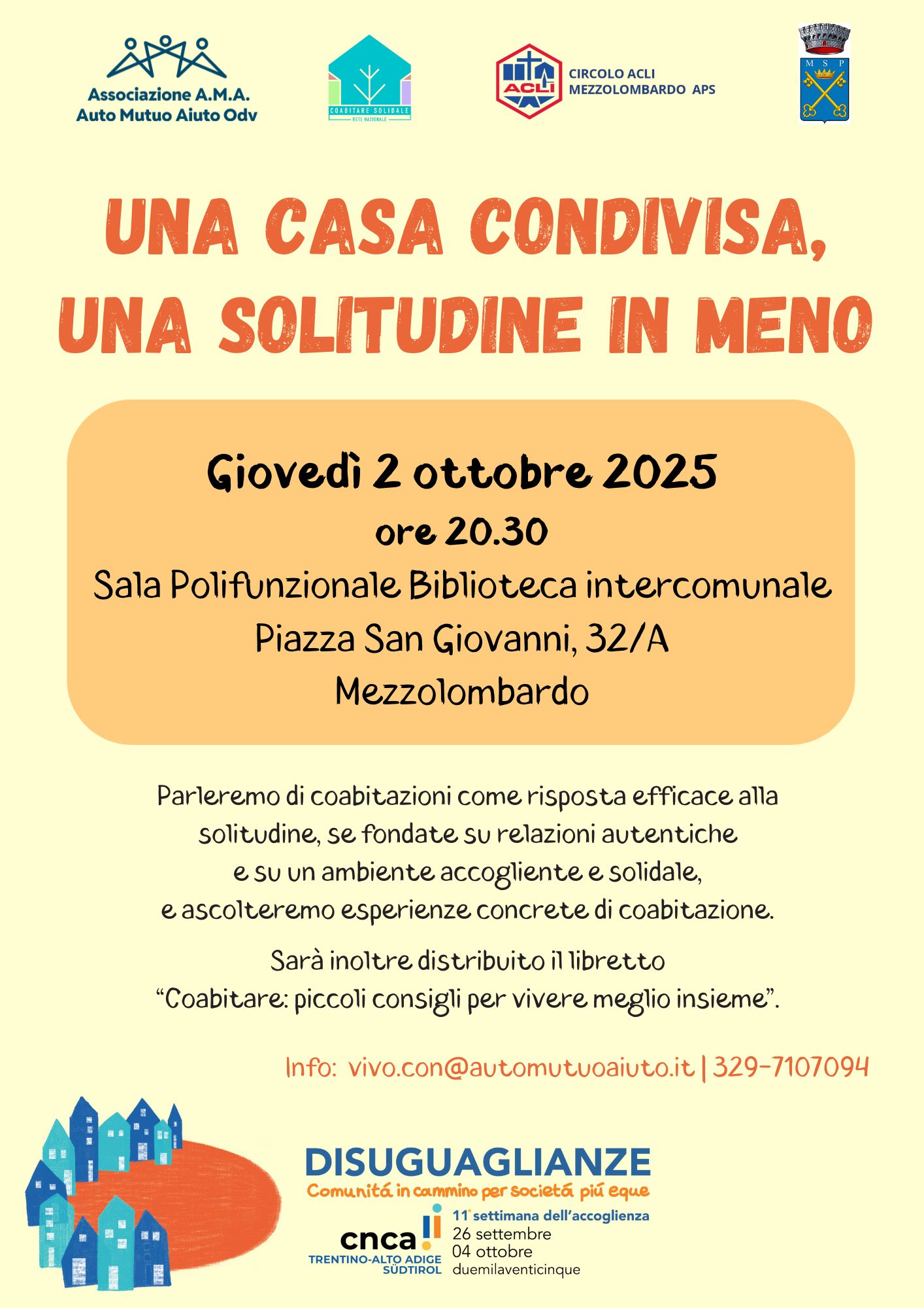 Durante l’incontro ascolteremo esperienze concrete di coabitazione e verrà distribuito il libretto “Coabitare: piccoli consigli per vivere meglio insieme”.