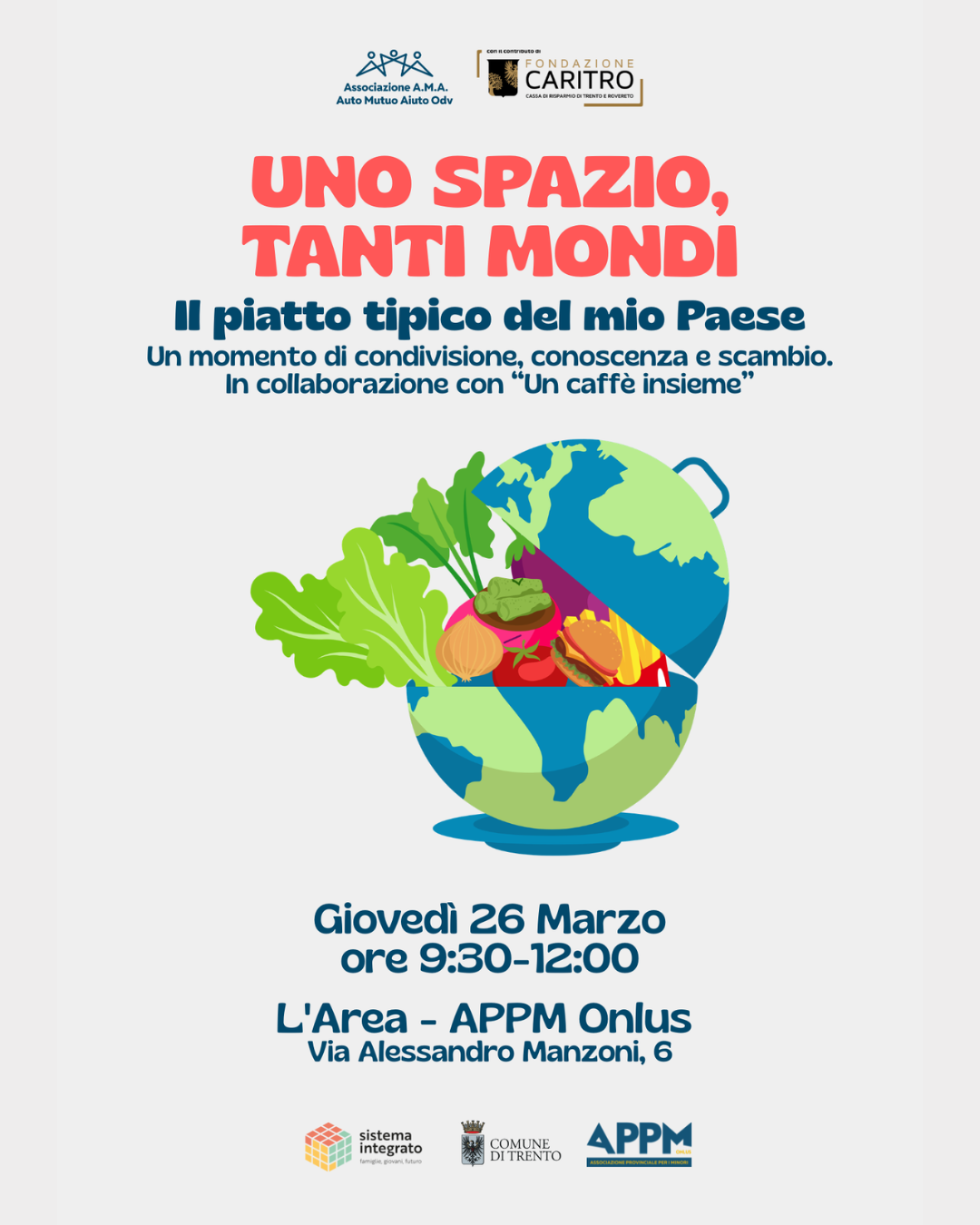 Ti invitiamo a un momento di condivisione e scambio, dove ognuno potrà portare un pezzo del proprio Paese attraverso il cibo.